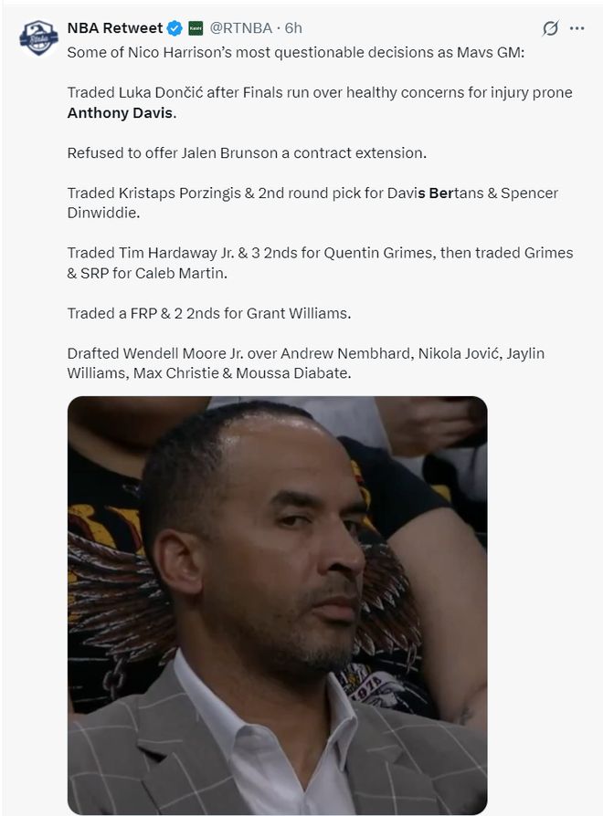 美媒HR写道:我真的不知道哈里森是如何留在独行侠GM任上这么久的,他活生生送走了一套夺冠阵容:布伦森、东契奇、格兰姆斯、小琼斯、波尔津吉斯。