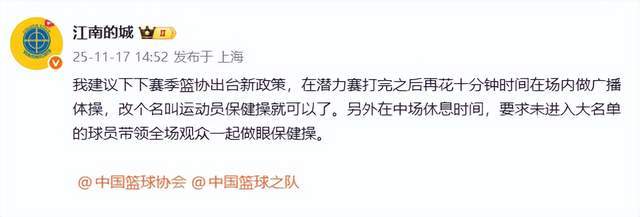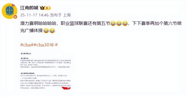 “江南的城”老师则连发2条动态,表达了自己的质疑,“潜力赛啊哈哈哈哈,职业篮球联赛还有第五节,下下赛季再加个第六节做完广播体操。