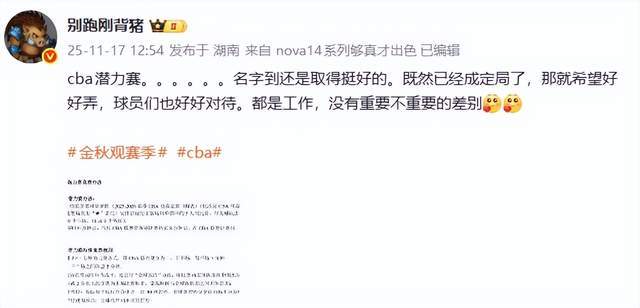 别跑刚背猪老师则认为,“cba潜力赛……名字到还是取得挺好的。既然已经成定局了,那就希望好好弄,球员们也好好对待。都是工作,没有重要不重要的差别。”
