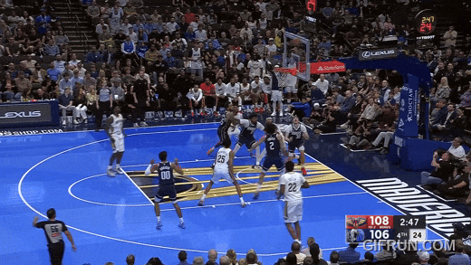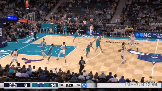 一个击地喂沃特森上篮,前因是接球不稳,拉文夹击,约基奇接球落地,转身击地,沃特森内切扣篮。