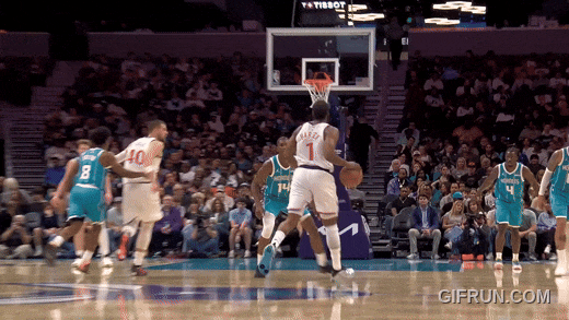 突破飞扣,但靠哄:拉球疑似要挡拆,骗动对面重心,直接变向突破。