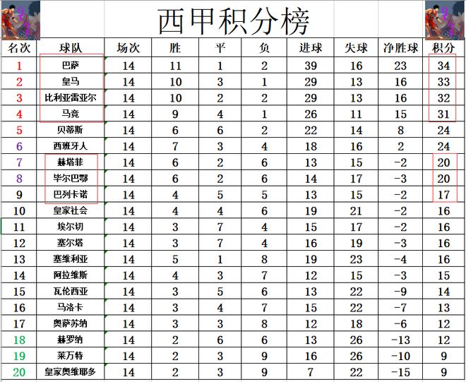 积分榜方面,榜首竞争很激烈,皇马一波3连平后,从领先5分到落后巴萨1分。皇马身后比利亚雷亚尔,马竞也追的很紧,现在形成了巴萨,皇马,黄潜,马竞依次1分之差从第1排到第4。巴列卡诺今天要是能赢球的话,就能紧咬第7,第8的赫塔菲和毕尔巴鄂竞技,但是先赢后平让他们落后了3分。