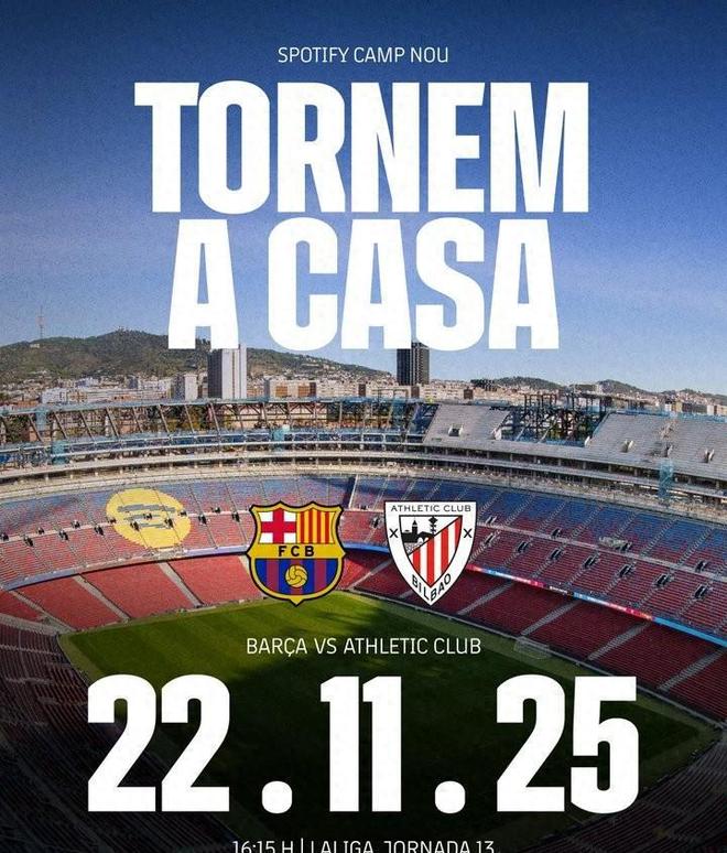 巴塞罗那俱乐部已于今日(2025年11月17日)通过官方社交媒体宣布:球队将于本周六(11月22日) 在翻新后的 Spotify 诺坎普球场迎战毕尔巴鄂竞技,这标志着红蓝军团在阔别主场 915 天 后,终于重返梦开始的地方。
